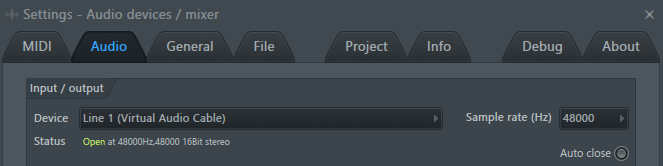 Simply download and install a virtual audio cable, then once it is installed, we can head back to FL Studio, and select Line 1 (virtual audio cable) as our audio device.