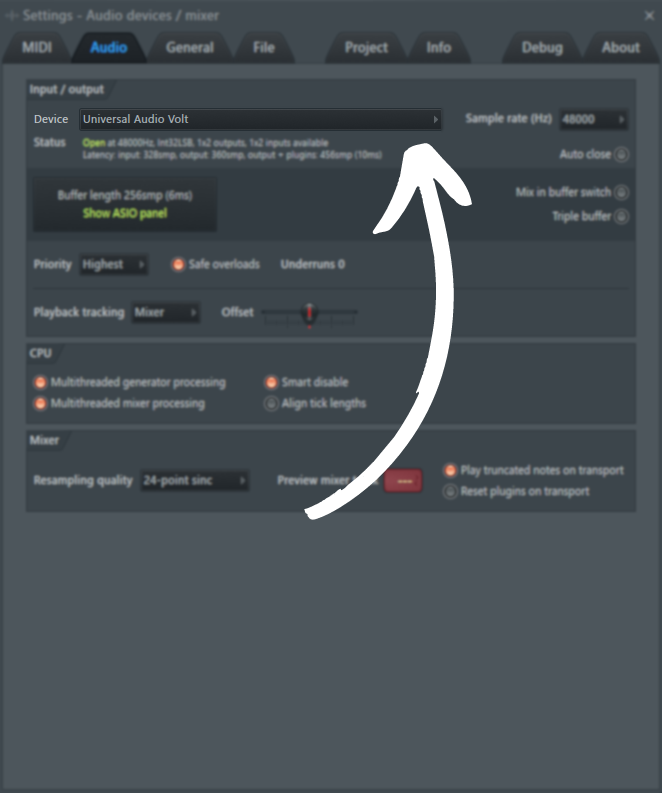 Here we can switch the audio driver, so in most cases you might be used to producing using ASIO drivers, or your audio interface driver. In my case I am using my Universal Audio Audio driver. We need to change this to MME/Directx driver for windows. The reason for this is because ASIO drivers do not let you route the audio anywhere else. So, with our MME/.Directx driver (or whatever default desktop audio you have), you can route that audio to SYQEL automatically.