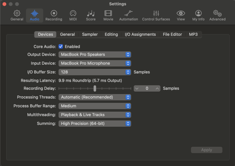 Alright, before we really dive into SYQEL, let’s set up Logic Pro to send audio into SYQEL. So, here I have my work in progress track open in Logic Pro. So, let’s go to Logic’s settings at the top left.