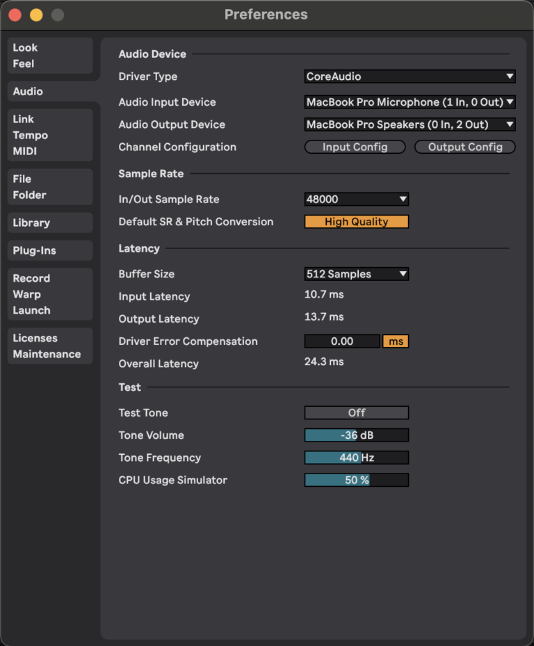 Within Ableton, all we need to do is go to our audio preferences, just like windows, however this time for our driver type, we need to have core audio selected.
