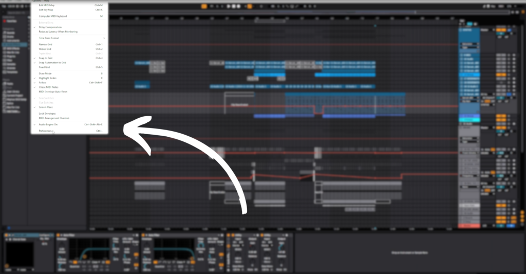Alright, before we really dive into SYQEL, let’s set up Ableton to send audio into SYQEL. So, here I have my work in progress track open in Ableton. So, let’s go to Ableton’s Preferences at the top left.