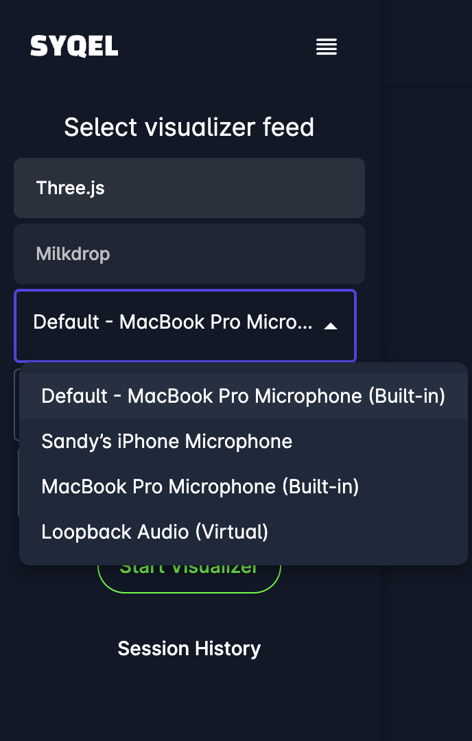 Great, now we are ready to go back to SYQEL, and select our audio input. Click on the visual engine you want to use on the left-hand side. Then, click on the audio input selection. Select Loopback Audio.