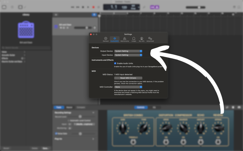 Alright, before we really dive into SYQEL, let’s set up Garageband to send audio into SYQEL. So, here I have a set open in Garageband. So, let’s go to Garageband’s settings.